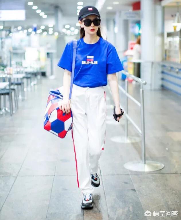 戚薇的这套机场look也是极具运动风格,白色侧边条纹运动裤搭配宝蓝色T恤,简直潮爆了,宝蓝色虽然衬肤,但是却很难搭配,当然,黑白色除外。